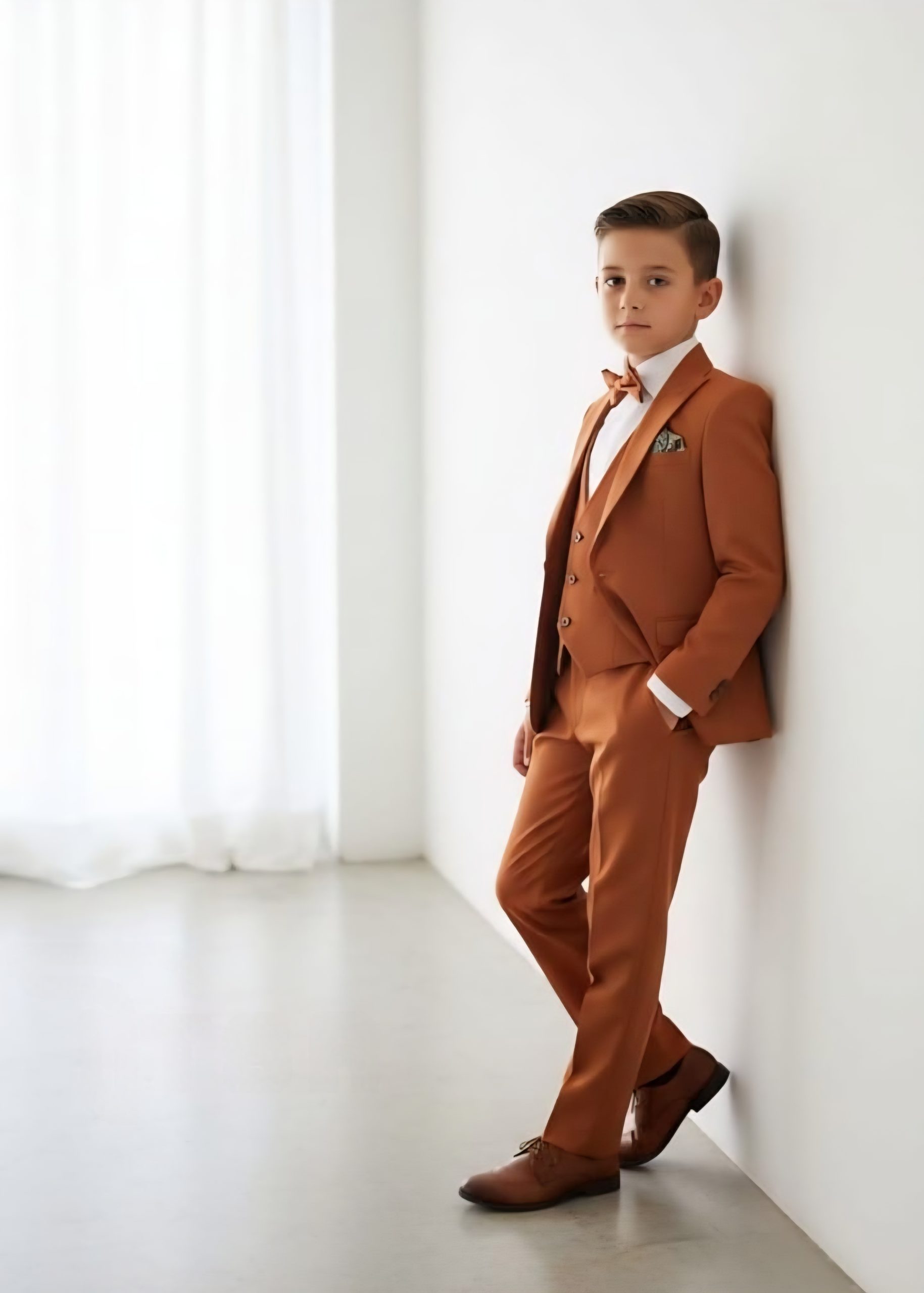 Admirez ce magnifique costume de haut de gamme, coupe cintrée et décontractée. Cet ensemble est composé de 5 pièces : veste, gilet, nœud de papillon, chemise et pantalon. Une couleur à la tendance: terracotta. Votre garçon peut le porter à toutes occasions mariages, ou autres. Le modèle de la chemise à l’intérieur peut varier selon la disponibilité en stock. (chemise simple classique ou comme sur la photo). Ce costume existe aussi en adulte vous avez la possibilité de faire père et fils !