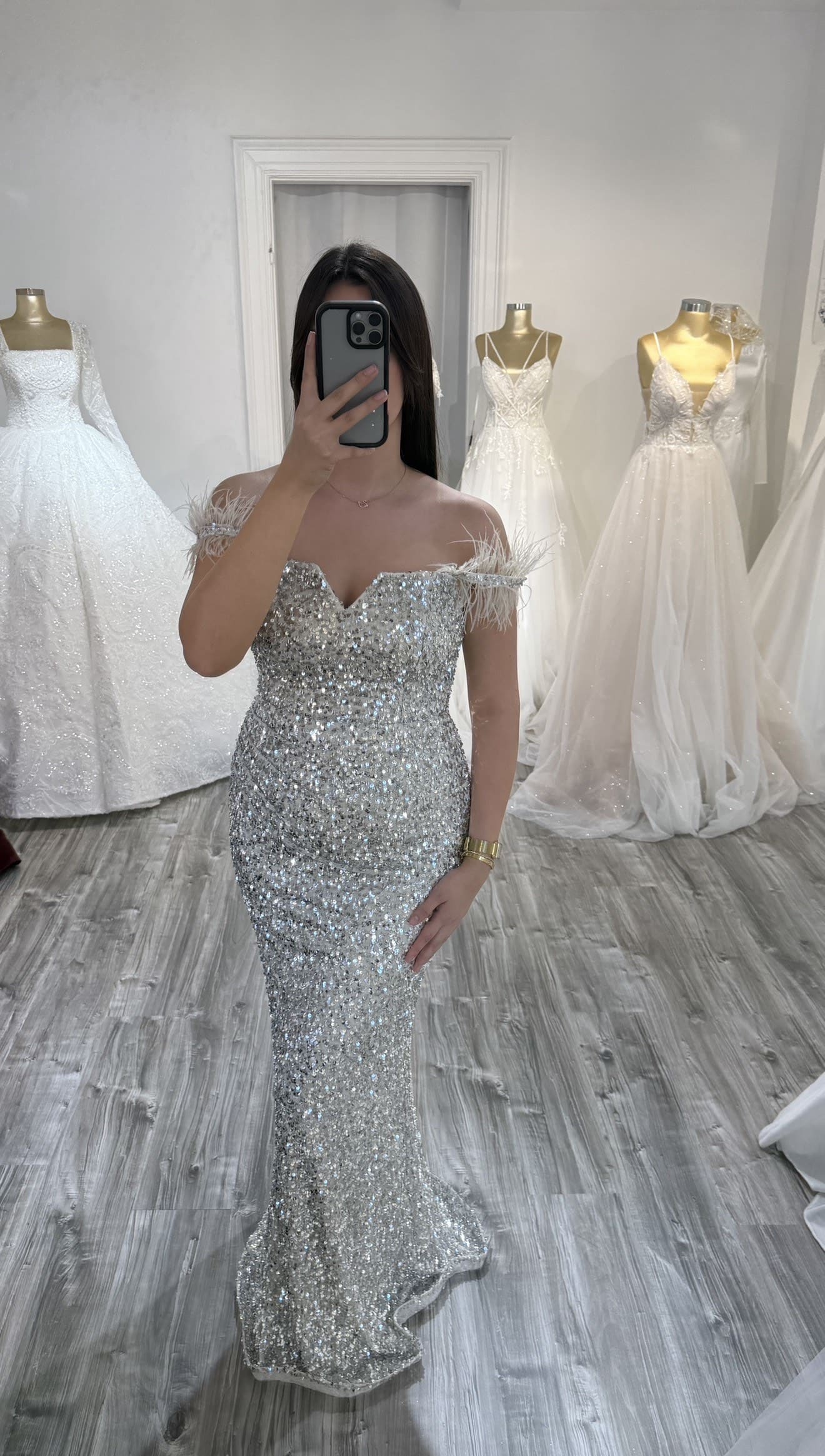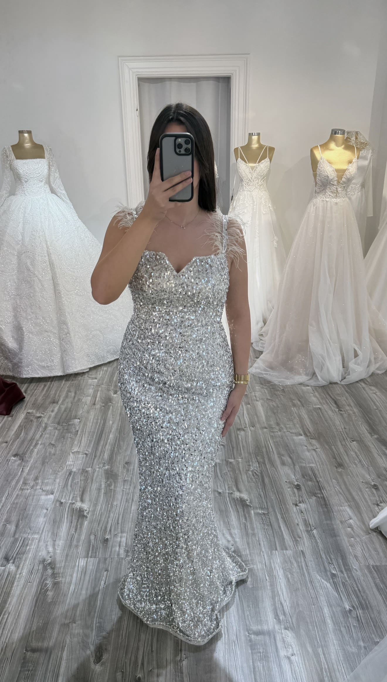 Entrez dans la lumière avec cette robe de soirée sirène. Conçue dans un tissu élastique à paillettes argenté scintillantes, elle capte la lumière à chaque mouvement. Sa coupe sirène cintrée met en valeur la silhouette, épousant les courbes jusqu’aux genoux avant de s’évaser légèrement vers le bas. Le décolleté en cœur offre un maintien parfait et une touche d’élégance. Ce qui distingue cette pièce, ce sont ses délicats détails en plumes qui ornent les épaules du bustier et les bretelles qui peuvent se porter en col bateau pour une touche de sophistication et structuré. La robe est dotée d’une fermeture éclair invisible dans le dos. Parfaite pour les mariages, les galas ou autres. Disponible en plusieurs tailles, couleurs et dans notre boutique à Mulhouse (Haut-Rhin, Alsace).